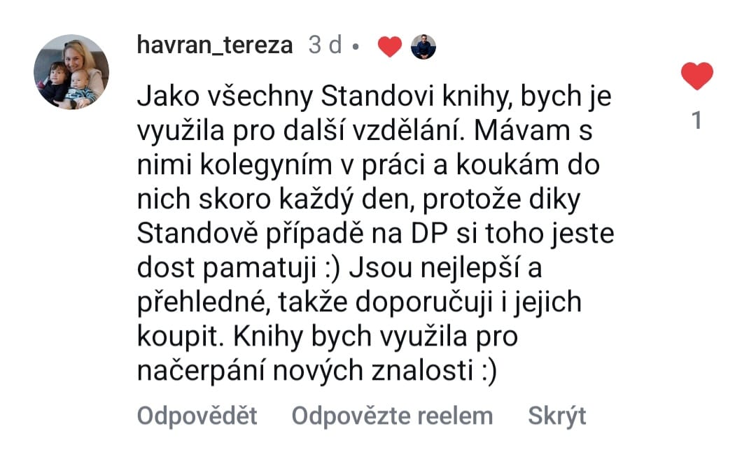 Najít na pomoc s přípravou na zkoušky Standu - to byla trefa do černého . Neocenitelné praktické rady, kvalitně zpracované knihy, které u zkoušek významně pomohou, webináře obsahující spoustu informací, to je skvělý základ přípravy. Připočtu-li k tomu i podporu ve formě chatu, otázky dne a další podpůrné metody, není na trhu nic lepšího. Mohu jen a jen doporučovat!