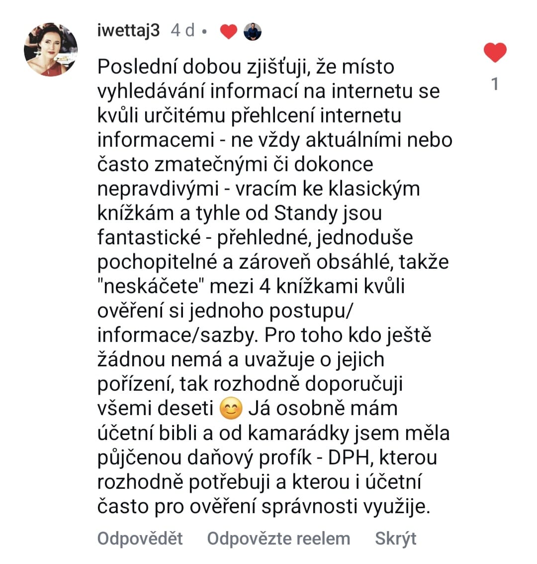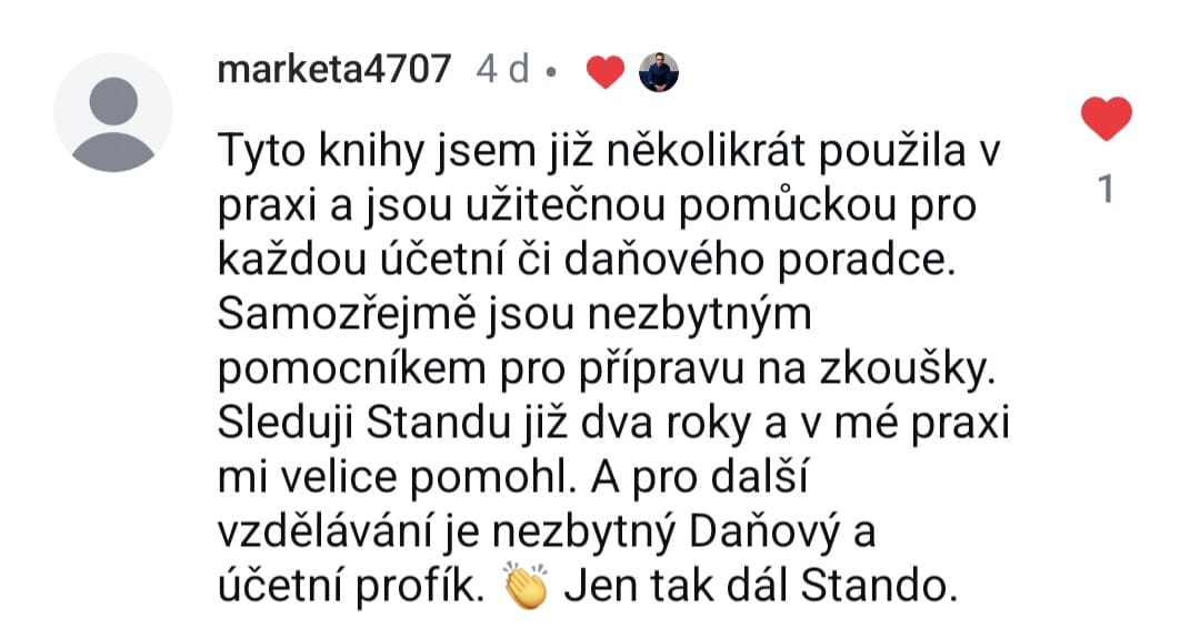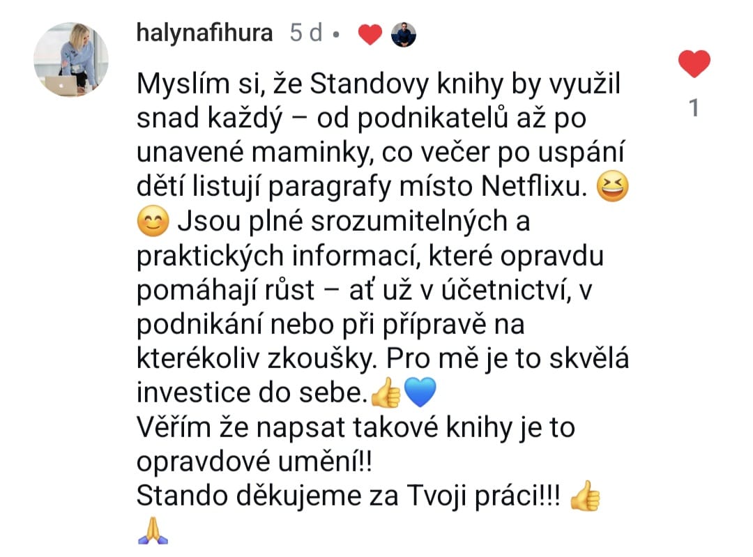 Pomáháte nám se udržet ve střehu a vaše knihy jsou top na trhu. Umíte poradit a vysvětlit každému a každý to pochopí. Občas se v těch zákonech ztrácím, ale s Vámi ne Stando. Účetnictví mě baví a ráda pomáhám druhým. A vy pomáháte nám se v tom celém dění se neztratit.