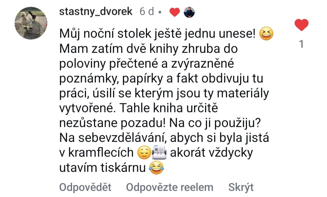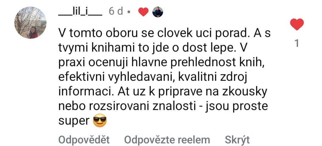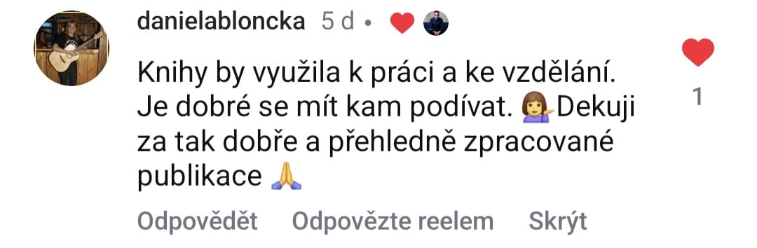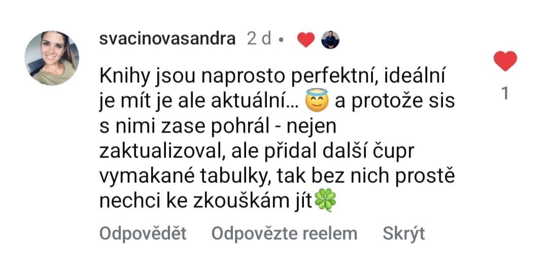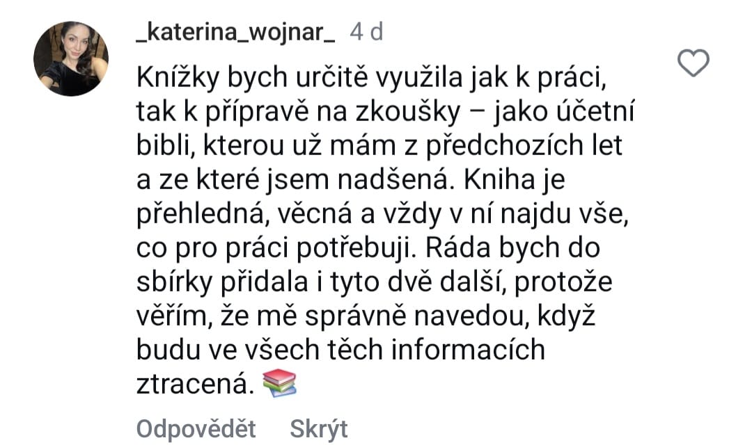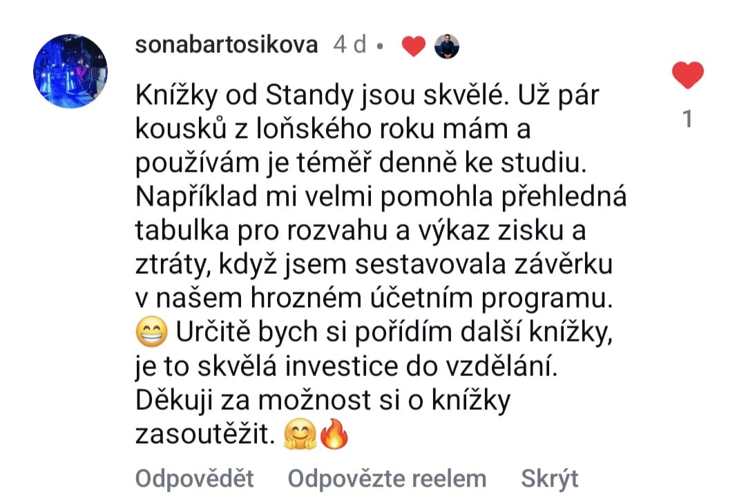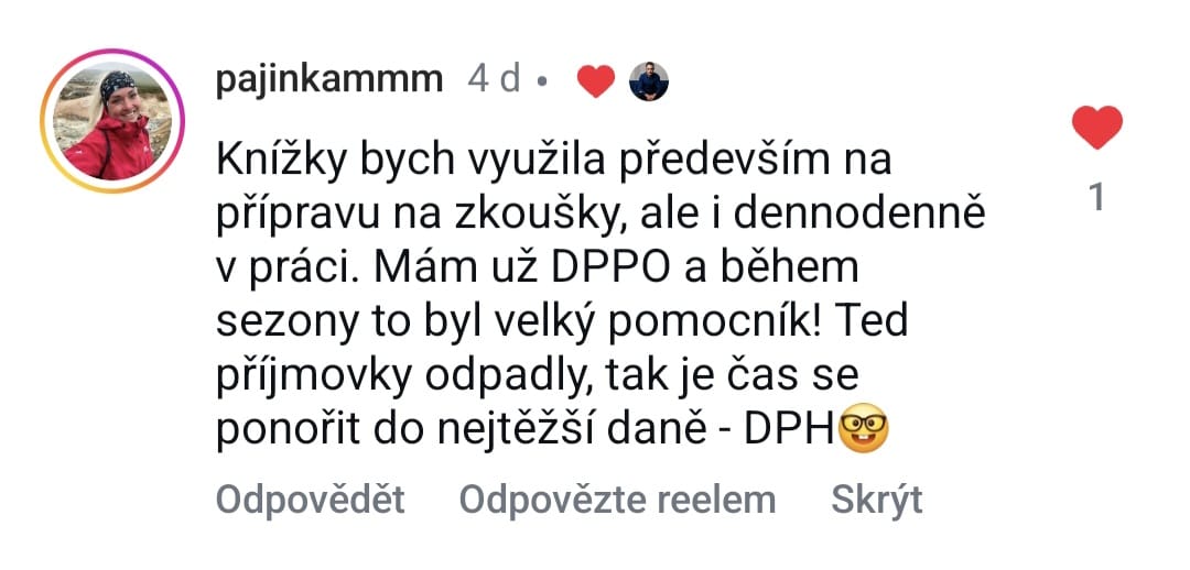 Důvod, proč Tě sleduji, je vlastně Tvá tvorba na Spotify - Tvoje podcasty na zdanění investic 😁 přes Tvoje podcasty na Spotify, který jsou skvěle a lidsky podaný, jsem se dostala na Tvůj profil na ig. Ten je pro mě přínosný díky reels a aktualitám ohledně daní, jelikož v tomto oboru pracuji a ráda bych se dokopala ke zkouškám DP 🙂 Díky za Tvou tvorbu a zároveň gratuluji k výhře 😊📚