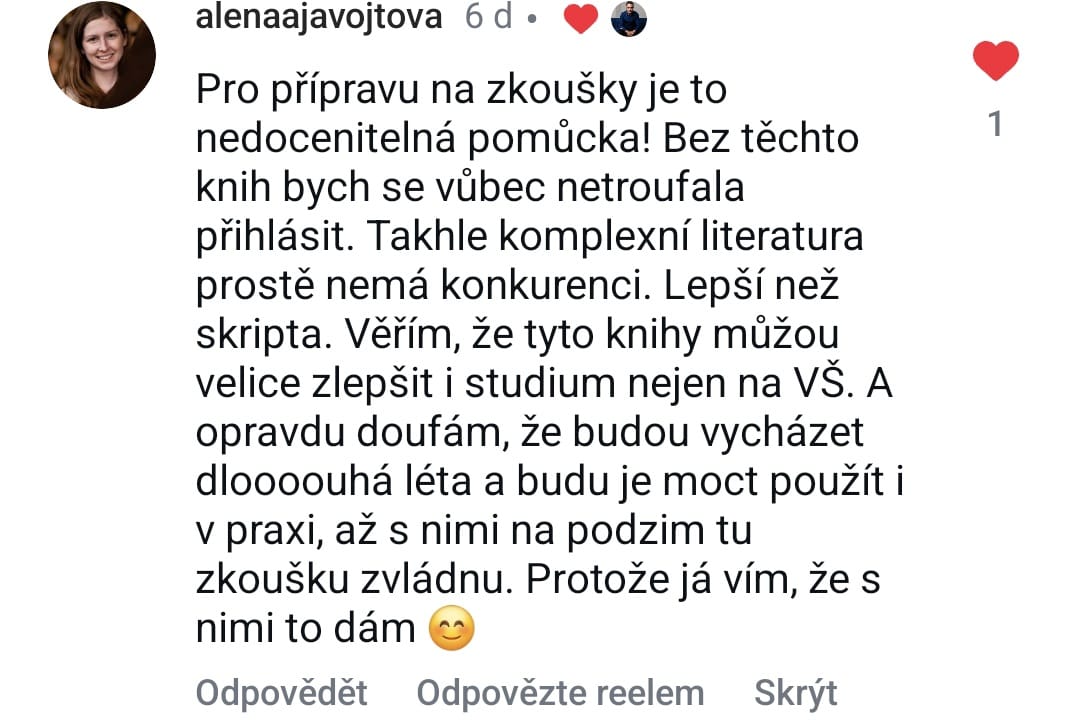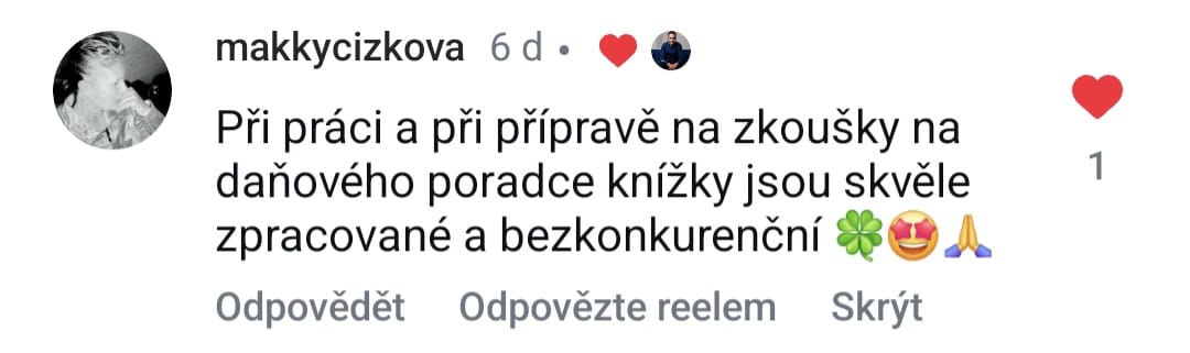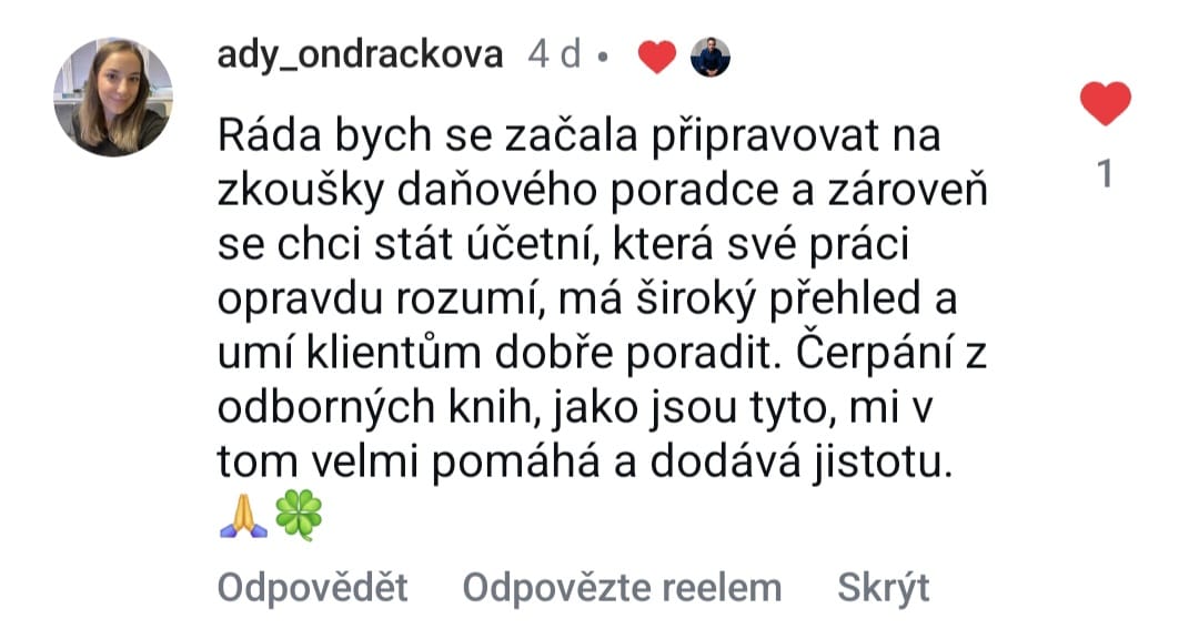 Ráda bych se jednou stala aspoň, z části, tak dobrý poradce jako vy. Sleduji Vás proto že jste inspirace, učení a zároveň skvělý člověk. Mám zakoupeno celý balíček učebnic. Doufám že za 2 semestry, až dokončit magisterský studium, budu se s Vama úspěšně připravovat na zkoušky daňového poradce. Přeji hodně úspěchů a jsem ráda že znám tak skvěle lidi.