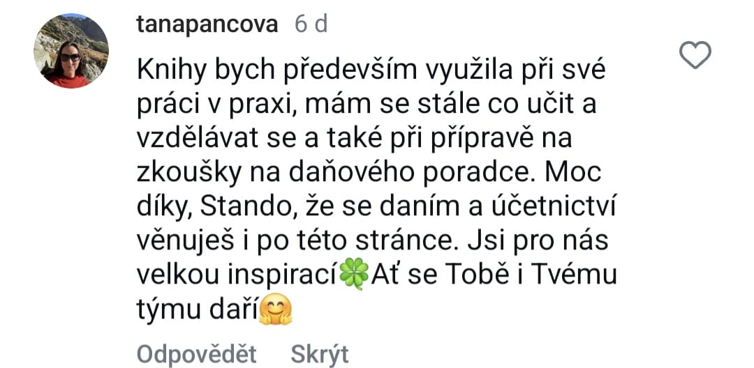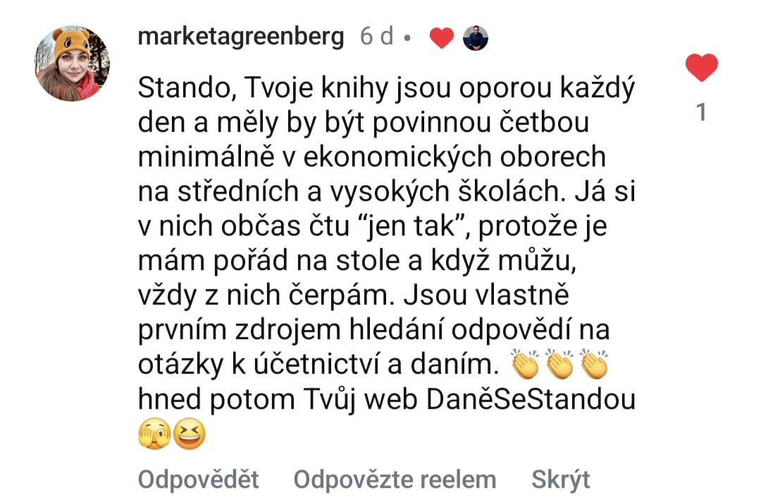 Stando, jste skvělý a neskutečný sympaťák. Moc Vám gratuluji ️ Strašně ráda čtu Vaše příspěvky, jsou super srozumitelné a snadno pochopitelné A proč účto a daně? To je jednoduché, říkám, že jisté jsou v životě dvě věci a to, úmrtí a placení daní .