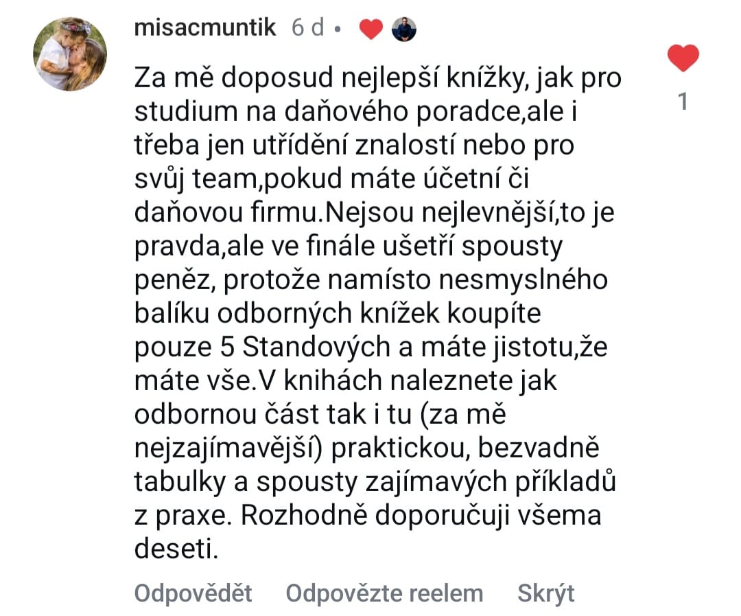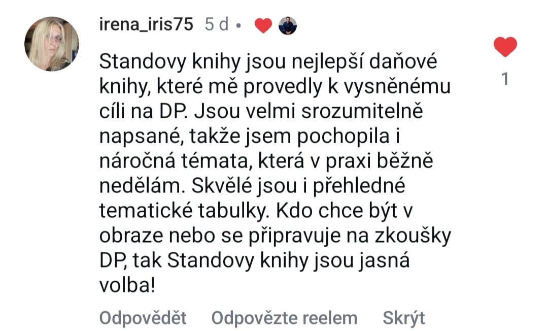 Ahoj Stando a všichni daňoví nadšenci. Jako účetní se živím už téměř 30let a stále mě to baví.. například to, že nikdy nemůžeme spadnout do stereotypu, protože je stále něco nového co musíme sledovat...stále se vzdělávat a učit se novinky. A jako třešnička na tomto životním dortíků by bylo kulaté razítko (vím že už se moc nepoužívají, tak berte s nadsázkou) daňového poradce. Se Standou jsem od jeho prvního ročníku přípravy na zkoušky...a ten posun je neskutečný...klobouk dolů, v jeho letech jsem pomalu "tahala účetního kačera" na provázku..a on maká, přednáší a předává informace a to takovým způsobem, že i já, starší kus, jsem se odhodlala na zkoušky pod jeho vedením jit. Mám už 50% hotovo a doufám, že letos to dotáhnu. Moc děkuji, Stando, že jsi a vždy se budu koukat na Tvoje novinky, články a vše co je spojeno a Tvými firmami.