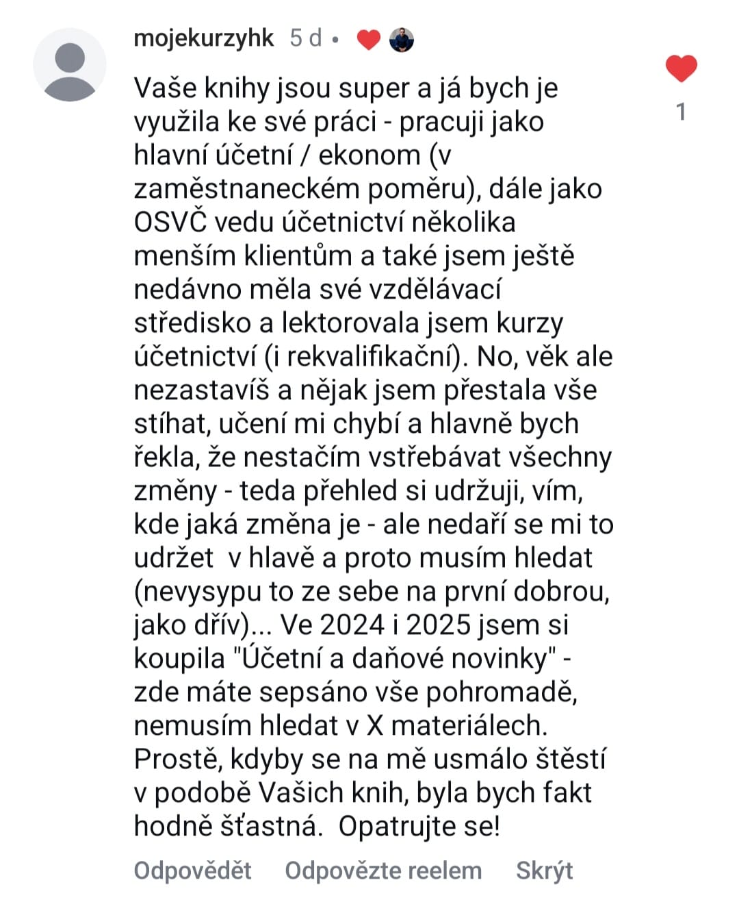Dělám účetnictví dlouhé roky a vás sleduji teprve krátce, ale vaše nadšení je opravdu nakažlivé. Člověk má hned pocit, že jeho práce má smysl. A moc se mi líbí způsob, jak nám ostatním pomáháte se orientovat v novinkách a problematice všeobecně. Děkuji a jen tak dál